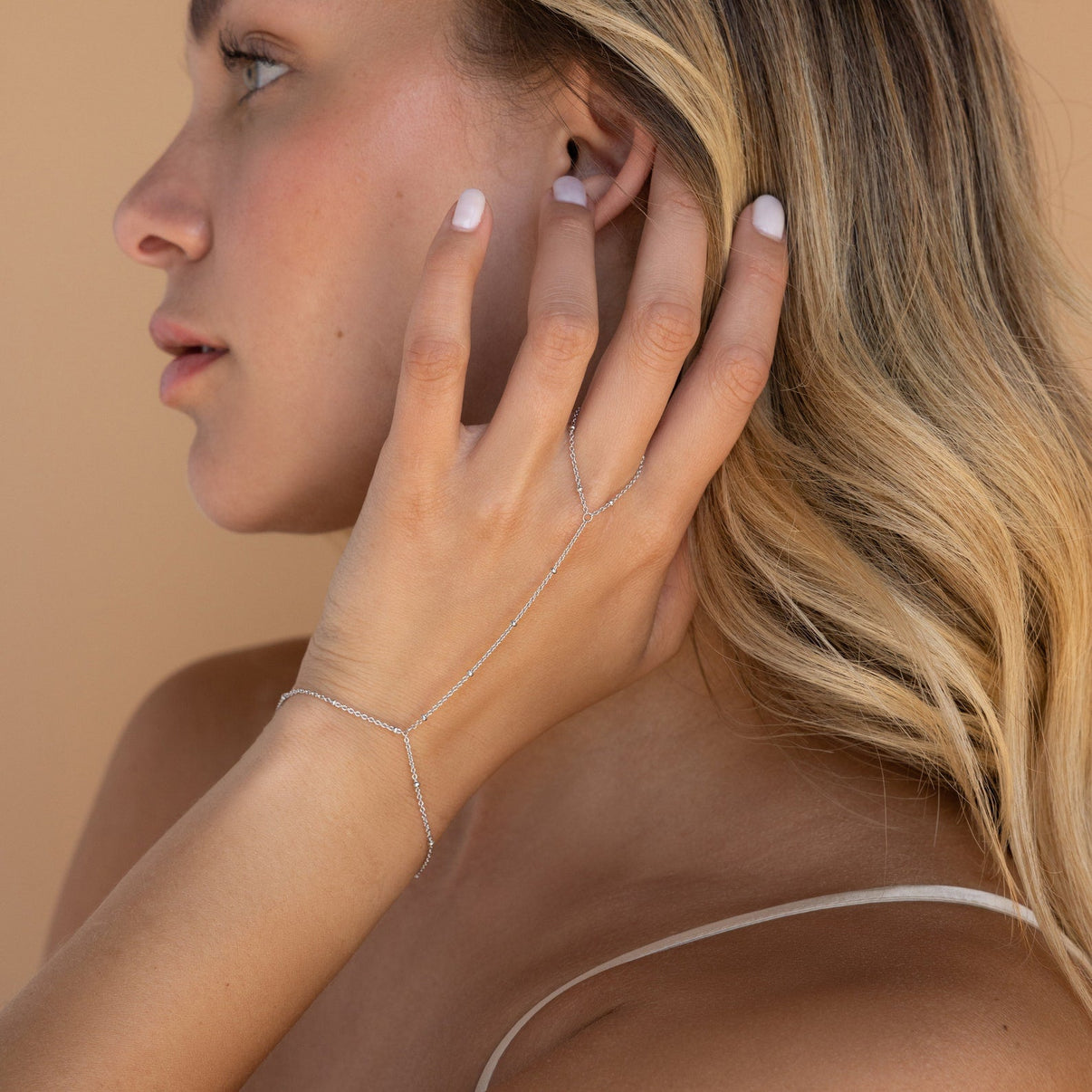 Our Beaded Hand Bracelet combines both a dainty bracelet and a chain ring for the best of both worlds. Wear alone and still have the feeling of entire jewelry look, or pair with your favorite rings to accentuate the boldness of your outfit. Either way, there is no doubt that you will turn heads with this statement piece.